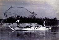 浦安の投網は「細川流〔すくい取り〕」と呼(よ)ばれる豪快(ごうかい)な投げ方で、江戸時代中期(えどじだいちゅうき)に肥後国(ひごのくに)〔今の熊本県(くまもとけん)〕の「細川の政(まさ)」によって伝えられたと言われています。 |